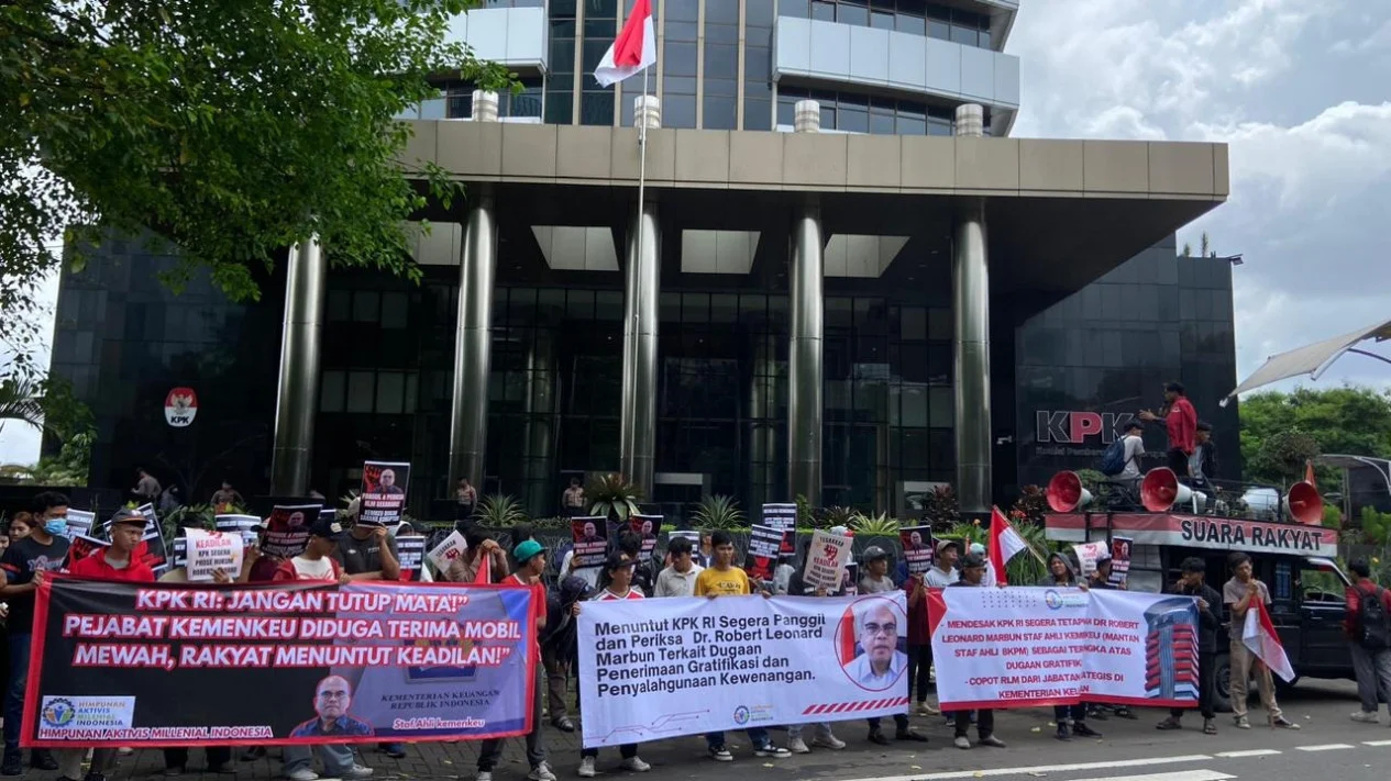 , Jakarta – Sejumlah aktivis yang tergabung dalam Himpunan Aktivis Milenial Indonesia mendatangi Gedung Komisi Pemberantasan Korupsi (KPK) di Jakarta, Senin (26/1/2026). Mereka meminta lembaga antirasuah tersebut menelusuri informasi mengenai dugaan penerimaan fasilitas kendaraan mewah oleh seorang pejabat di lingkungan Kementerian Keuangan.