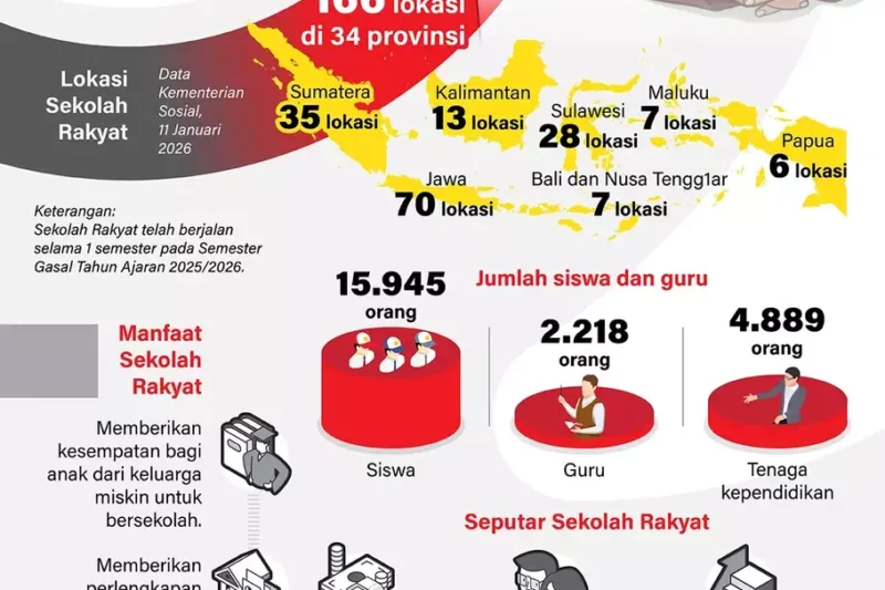 13 Januari 2026 - 11:38 WIB Dari Akses hingga Masa Depan: Jejak Sekolah Rakyat di Seluruh Indonesia Program Sekolah Rakyat mulai menunjukkan dampak nyata bagi dunia pendidikan Indonesia. Hingga awal 2026, sebanyak 15.945 siswa telah