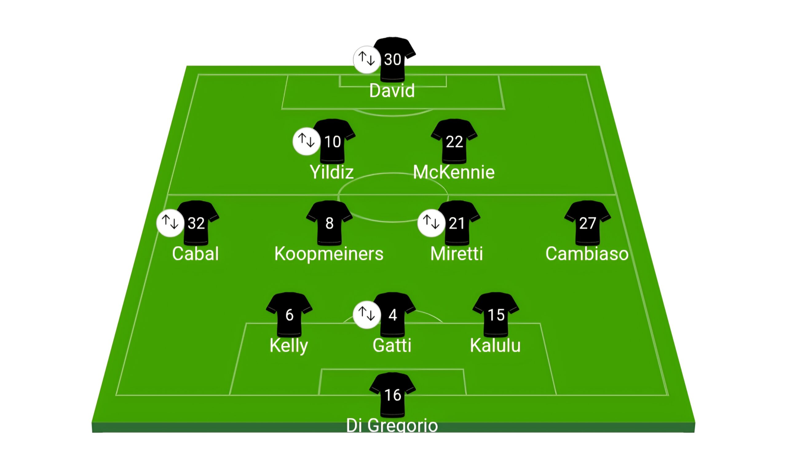 Juventus: Di Gregorio; Cambiaso, Kalulu, Gatti, Kelly, Cabal; Koopmeiners, Miretti, McKennie, Yıldız, David.