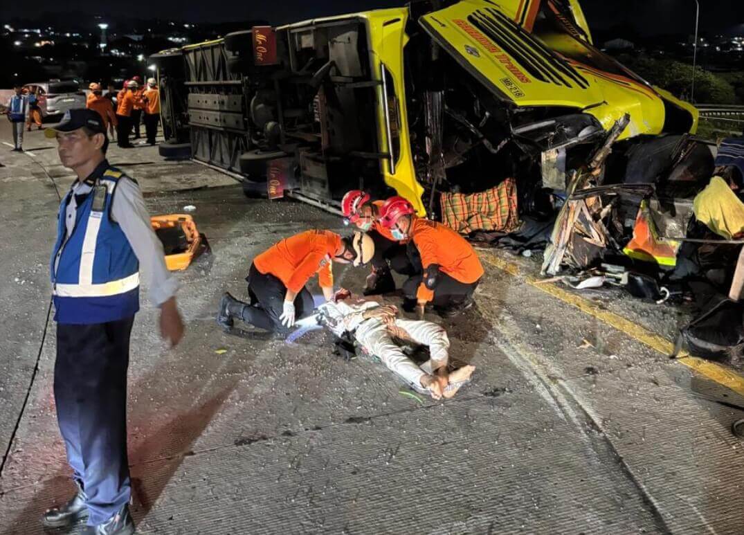 Tim SAR gabungan, yang terdiri dari Basarnas, kepolisian, petugas Jasa Marga, PMI, serta tenaga medis, segera bergerak ke lokasi untuk melakukan proses evakuasi. Petugas membutuhkan waktu cukup lama untuk mengevakuasi korban karena kondisi bus yang ringsek dan posisi kendaraan yang terguling di badan jalan tol.